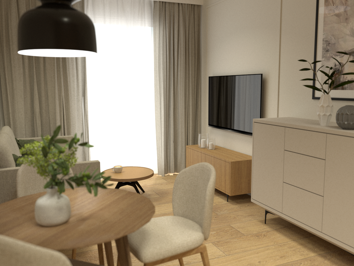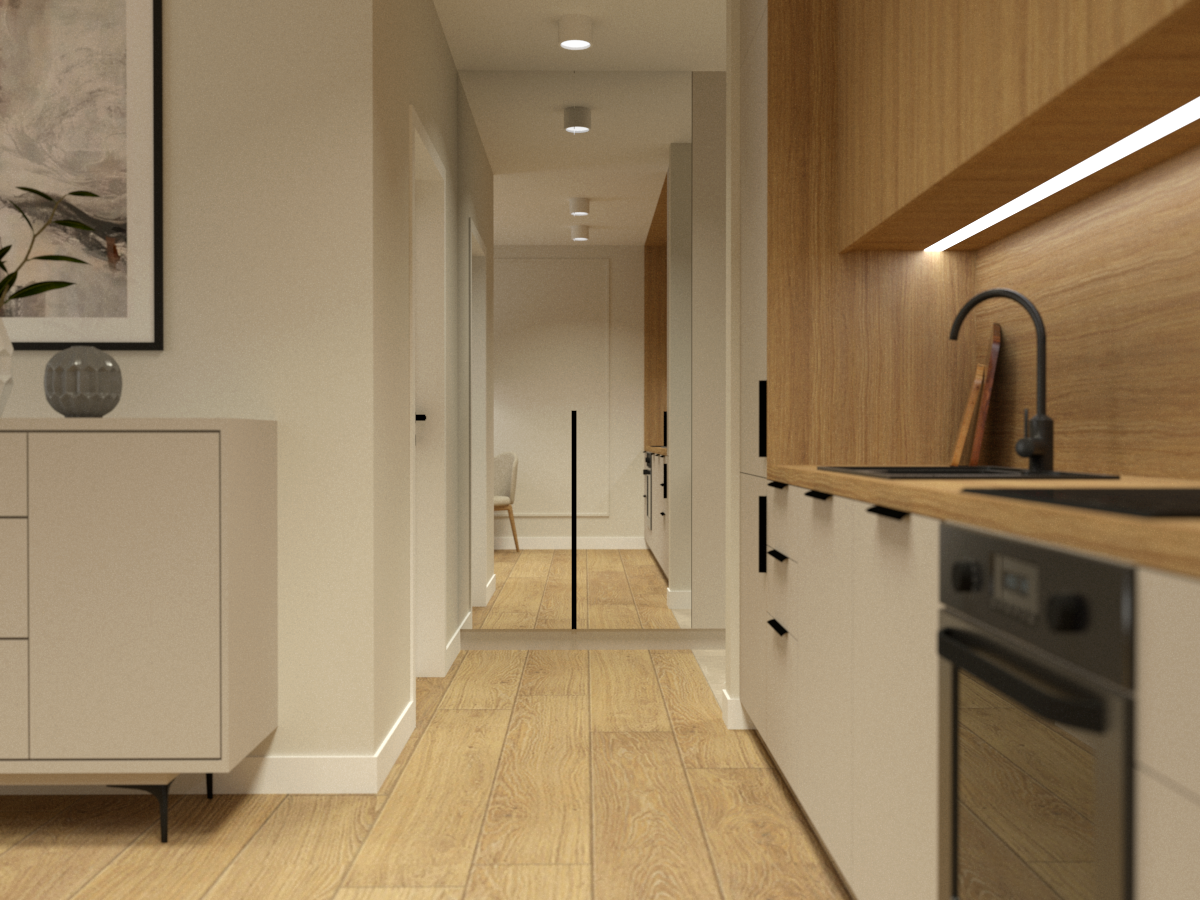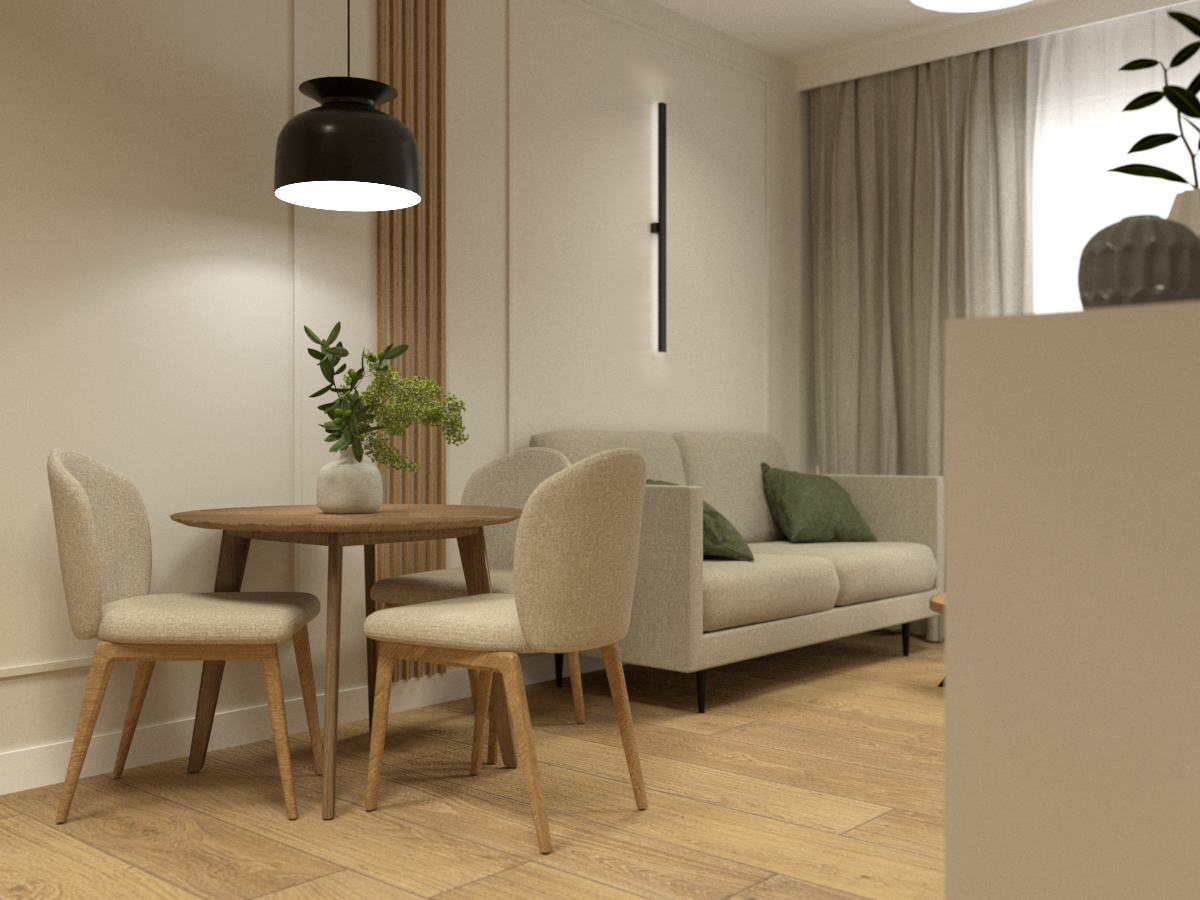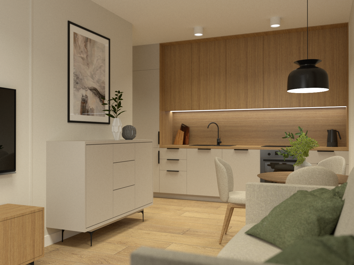Strefa dzienna z aneksem kuchennym w odcieniach beżu i naturalnego drewna tworzy spójną całość.