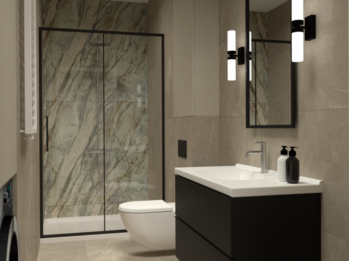 Łazienka utrzymana w neutralnych kolorach z delikatnym akcentem czerni wprowadza subtelny kontrast.